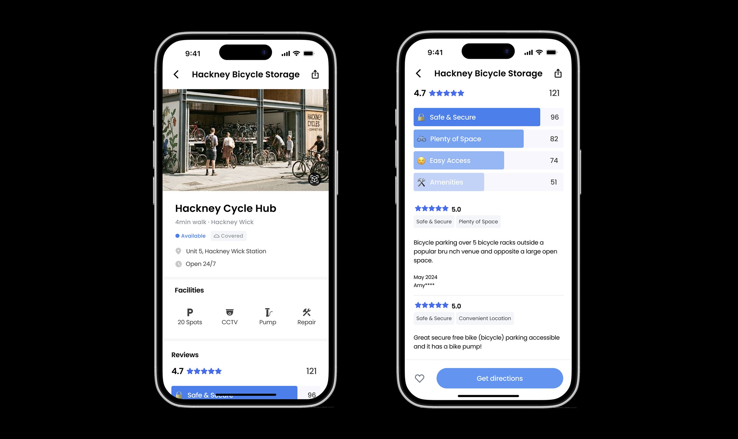 Frictionless Decision Making: Standardised facility icons (CCTV, Repair) allow for instant scannability. Once the user is convinced, the prominent, sticky 'Get directions' CTA ensures an effortless transition from the decision phase to active navigation.