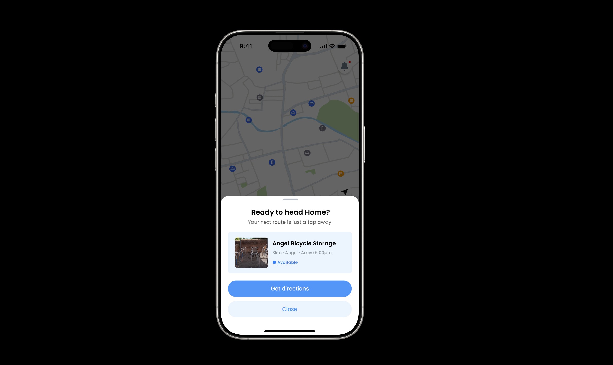 The user finishes their daily activity and opens the app to pick up their bike. The app predicts their next move and prepares the route back.